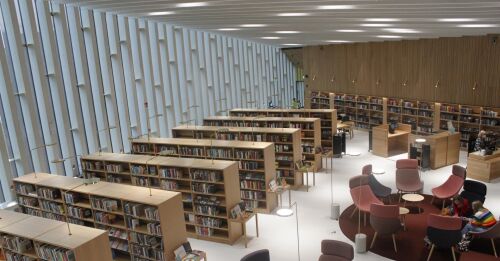 내부는 4,700제곱미터의 공간에 서가와 열람실, 그리고 전시 공간, 이벤트 공간, 유아 및 청소년 클럽을 위한 공간, 대형 카페 등 다양한 커뮤니티 공간이 있습니다. 이 도서관은 더 이상 책에 초점을 맞추지 않고, 현대의 아이디어는 “지식”이라는 우산 아래 사람들을 모으는 것을 강조하고 있습니다. 그래서 더 친밀한 공간을 만들기 위해 사용되는 기존 구조의 어색함을 개선하여 건물의 사용 범위 내에서 다양한 공간을 만드는 것을 목표로 했습니다.